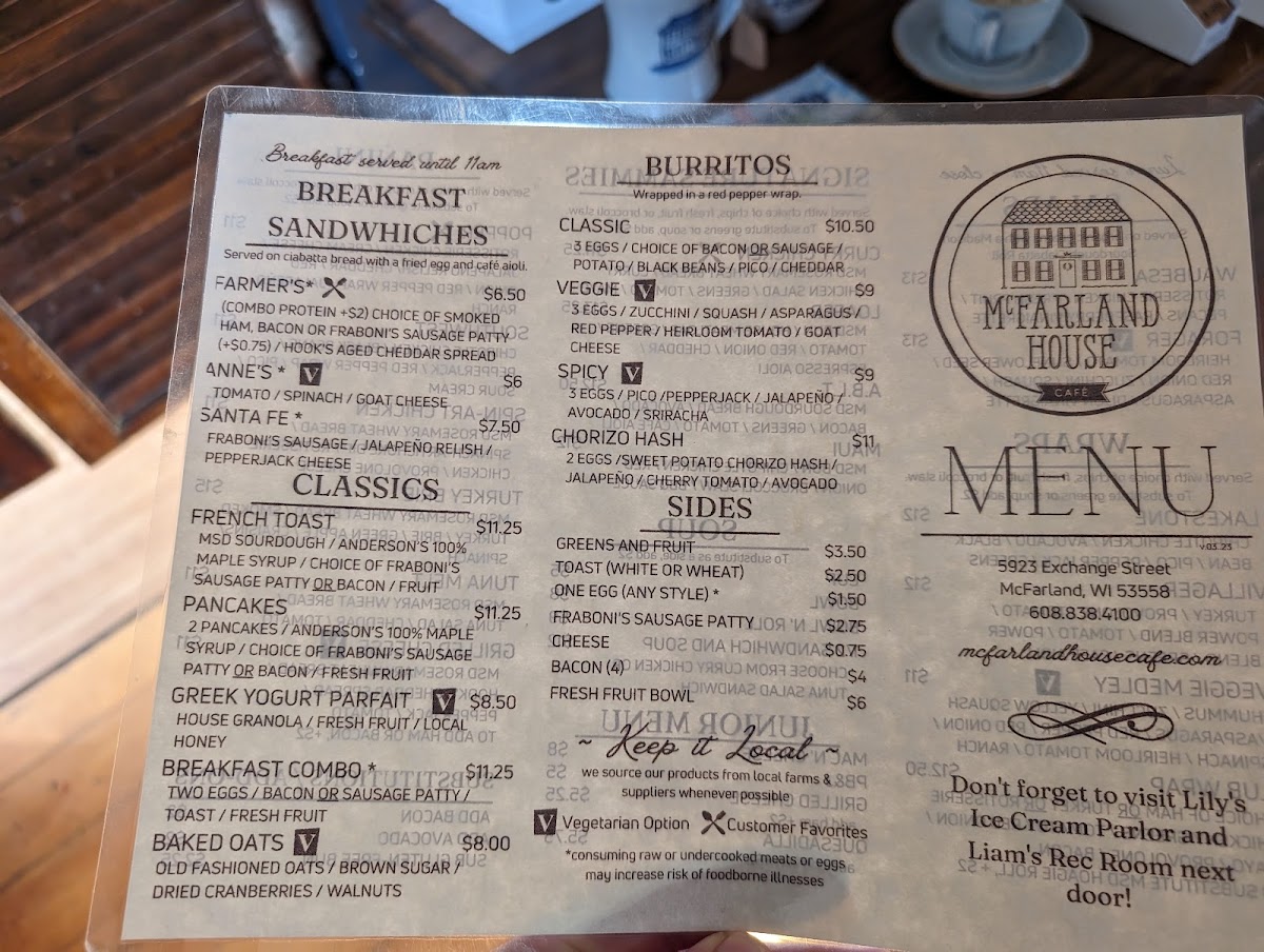 Welcome to McFarland House Cafe, a charming gem nestled in the heart of downtown McFarland, WI. This cafe boasts a diverse menu perfect for breakfast or lunch, featuring exquisite paninis like the Turkey Brie and Enchilada Panini, both served with a delightful choice of sides such as chips or fresh fruit.
